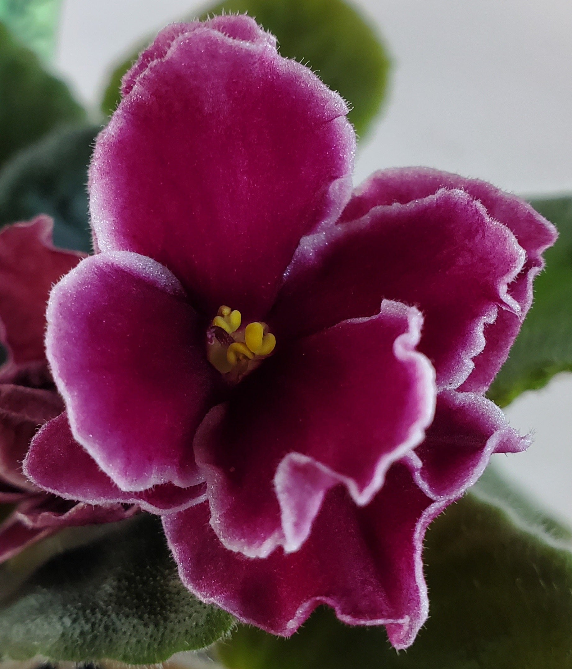 Bob Serbin (J. Brownlie (8292) 09/21/95) Semidouble red sticktite pansy, thin white edge, dark green, quilted, serrated red back. Standard.