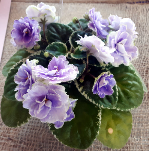 Buckeye Seductress (9669) 07/13/2006 (P. Hancock) Double dark lavender star/wide white band, green edge. Variegated medium green and cream, plain. Large