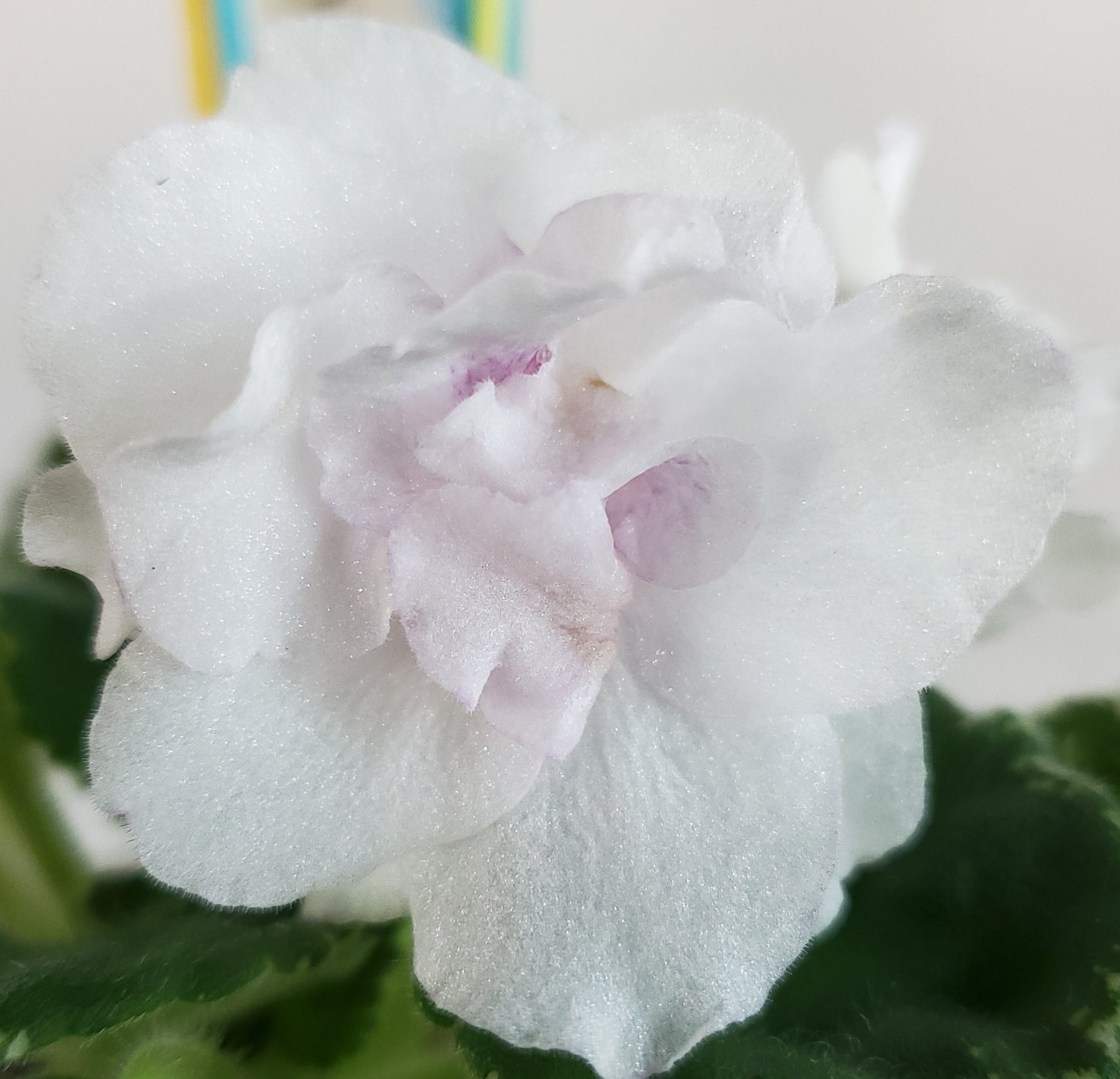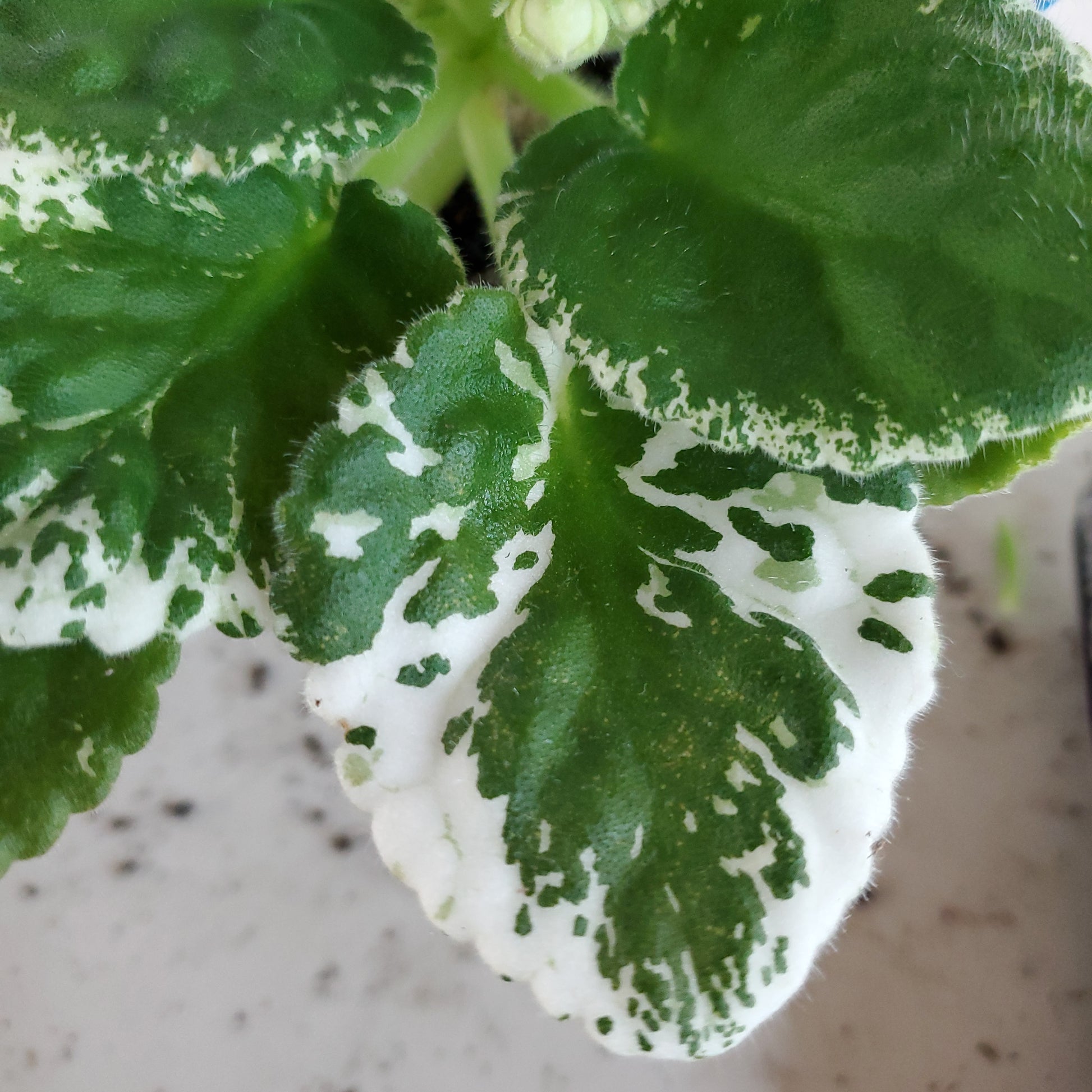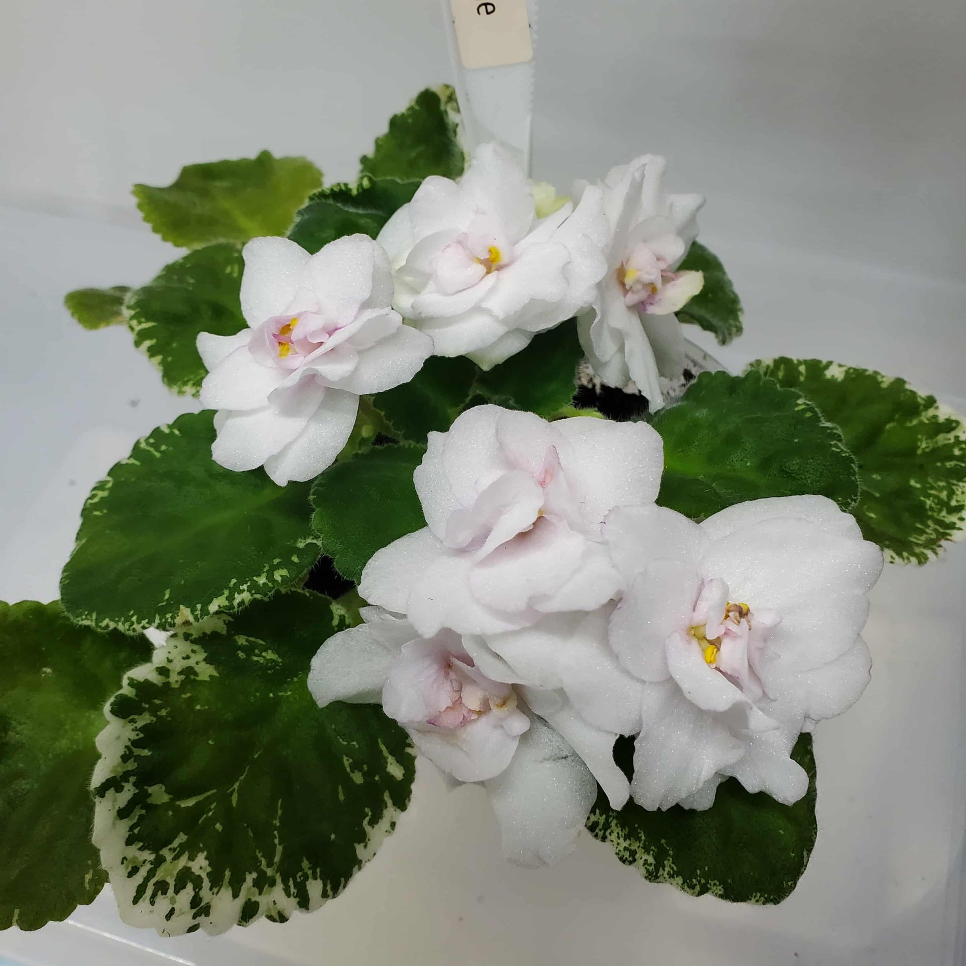 Cajun's Blush Me (B. Thibodeaux) Semidouble pale pink stars/raspberry eye. Variegated medium green and white, round, quilted, serrated. Standard