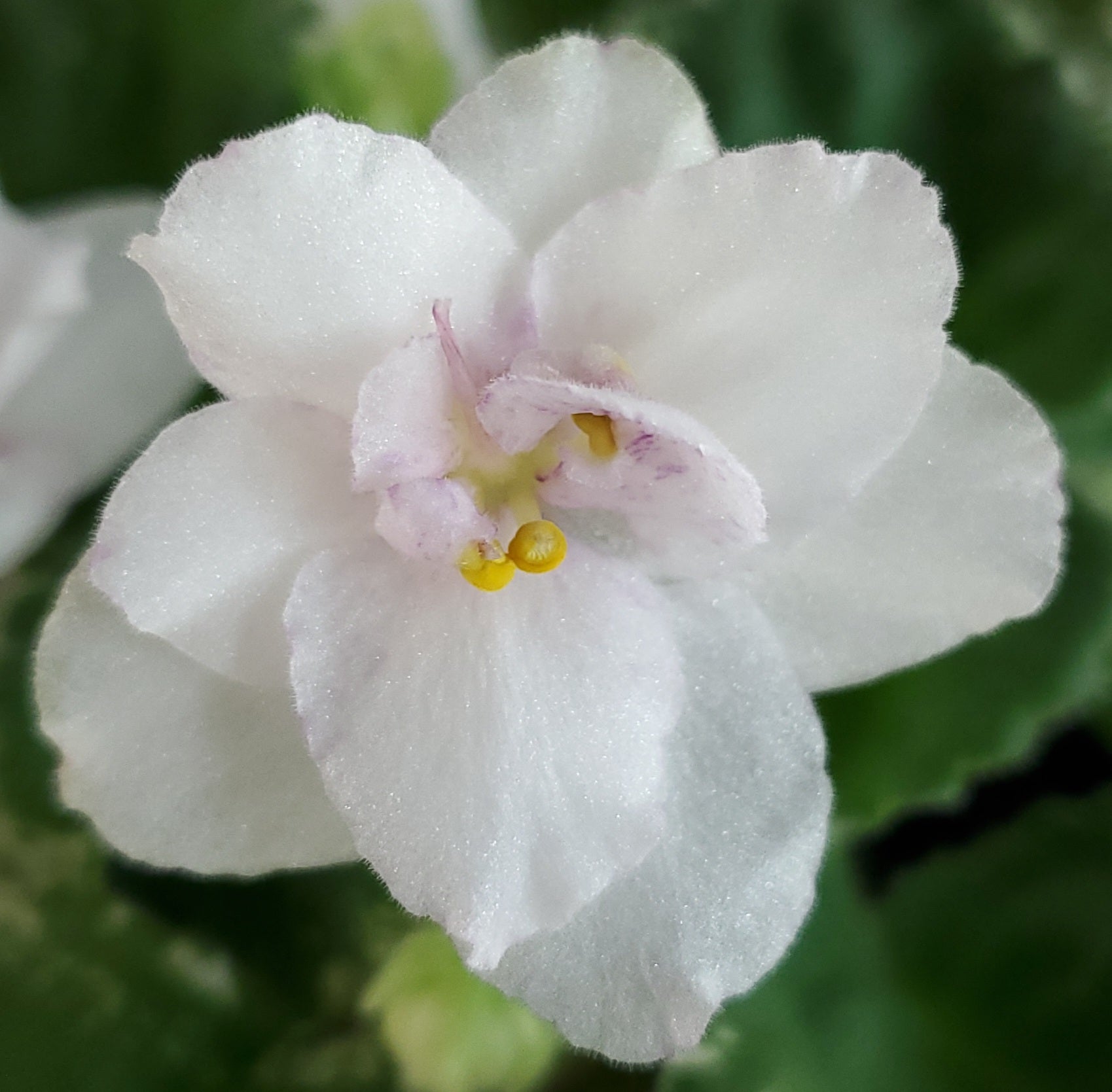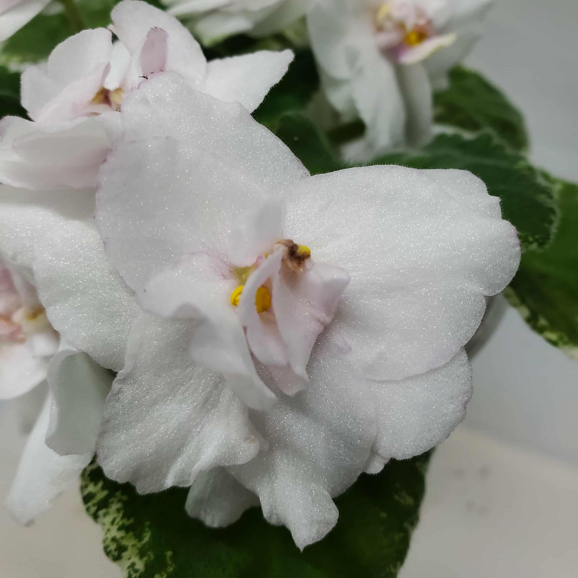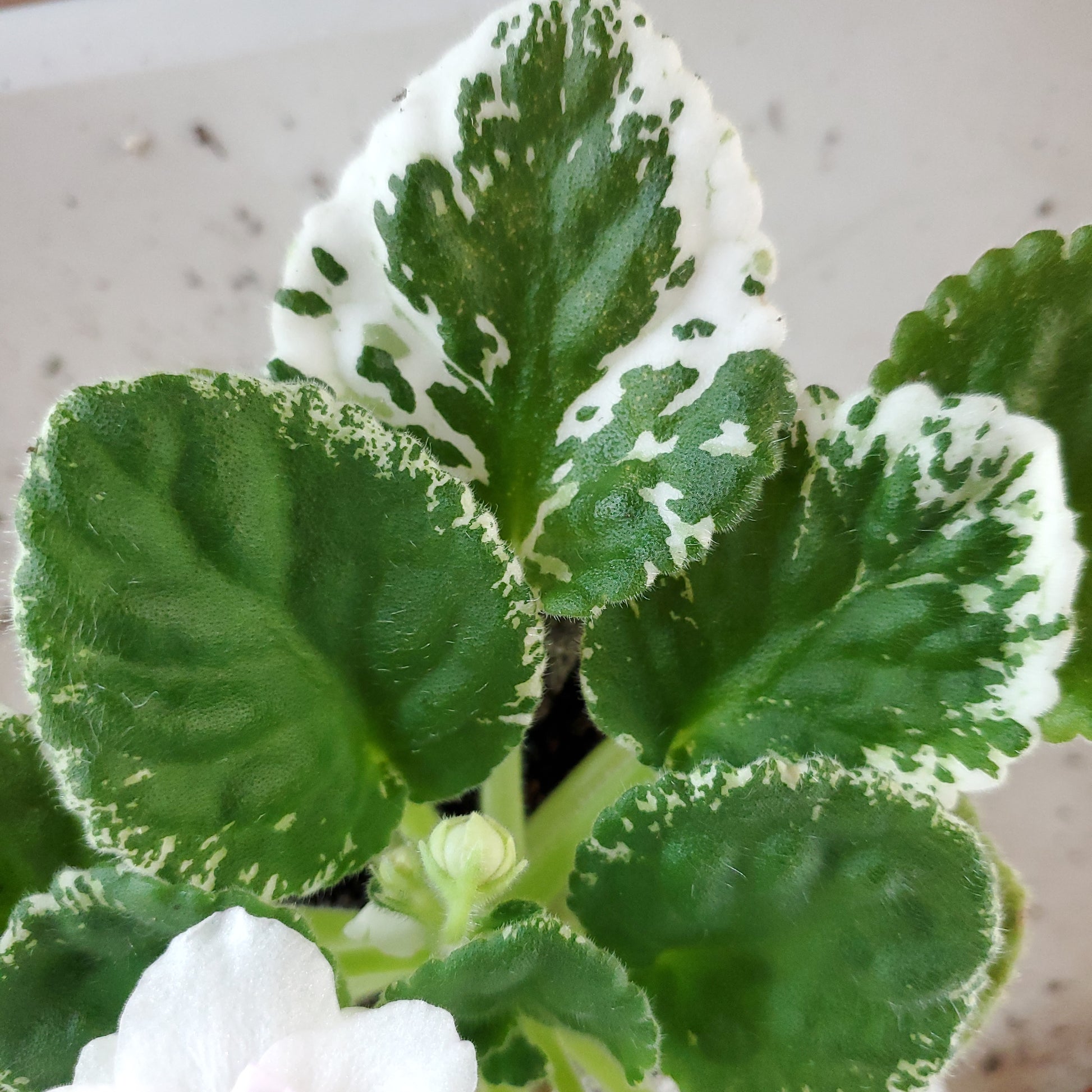 Cajun's Blush Me (B. Thibodeaux) Semidouble pale pink stars/raspberry eye. Variegated medium green and white, round, quilted, serrated. Standard