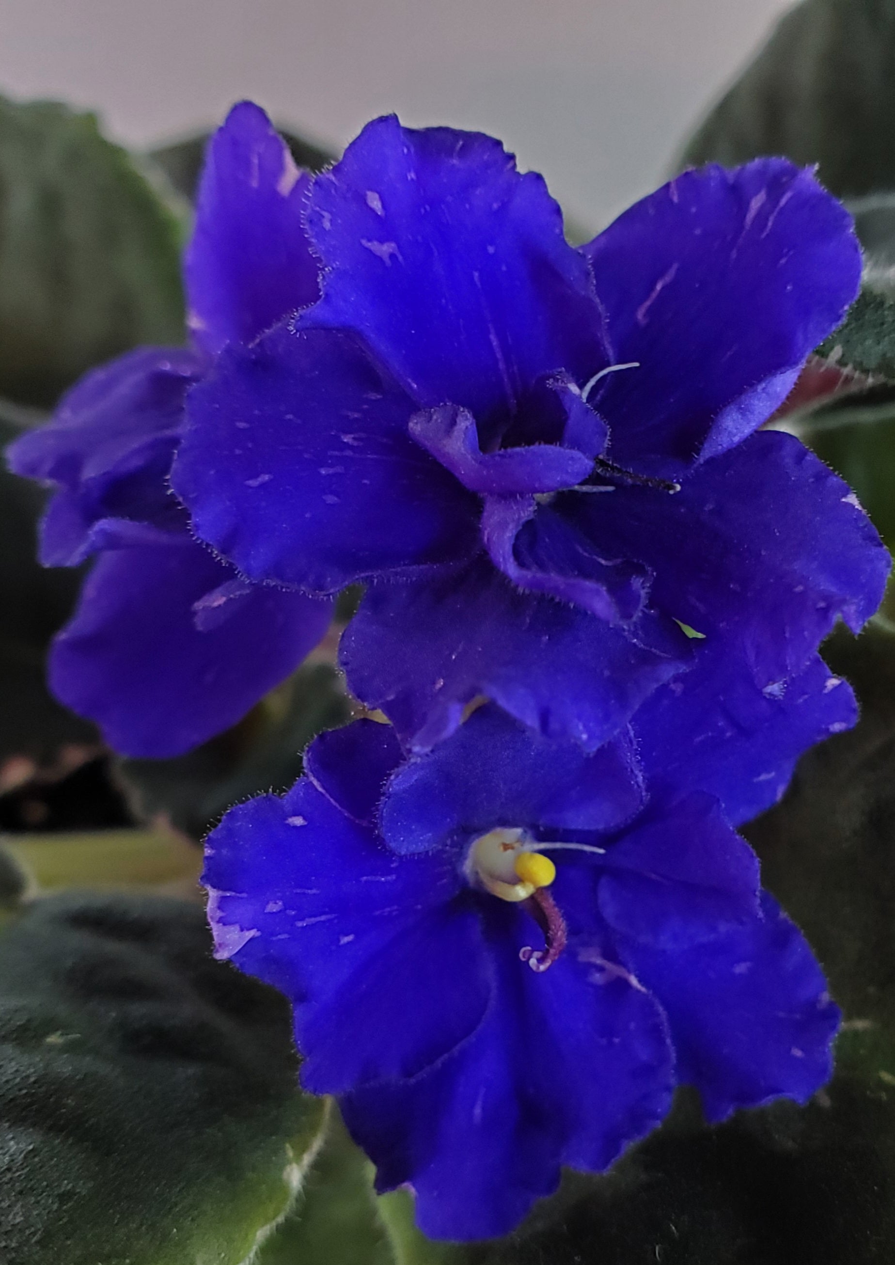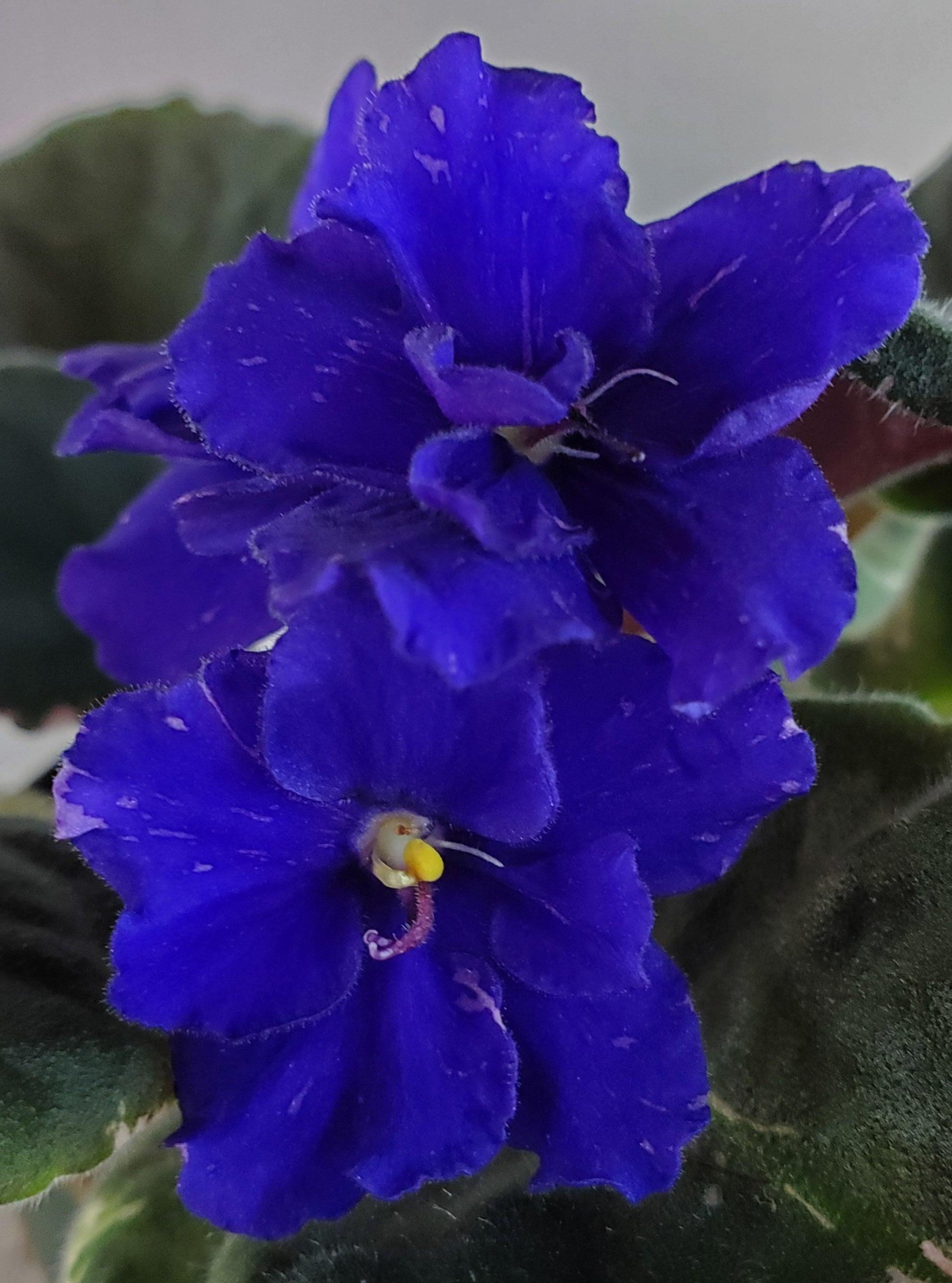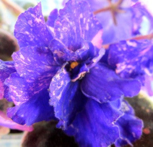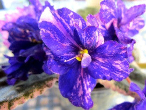 Cajun's Drama Queen (B.Thibodeaux) Semidouble dark blue frilled pansy/ pink and white fantasy. Variegated medium green, white and pink, serrated, plain. Standard