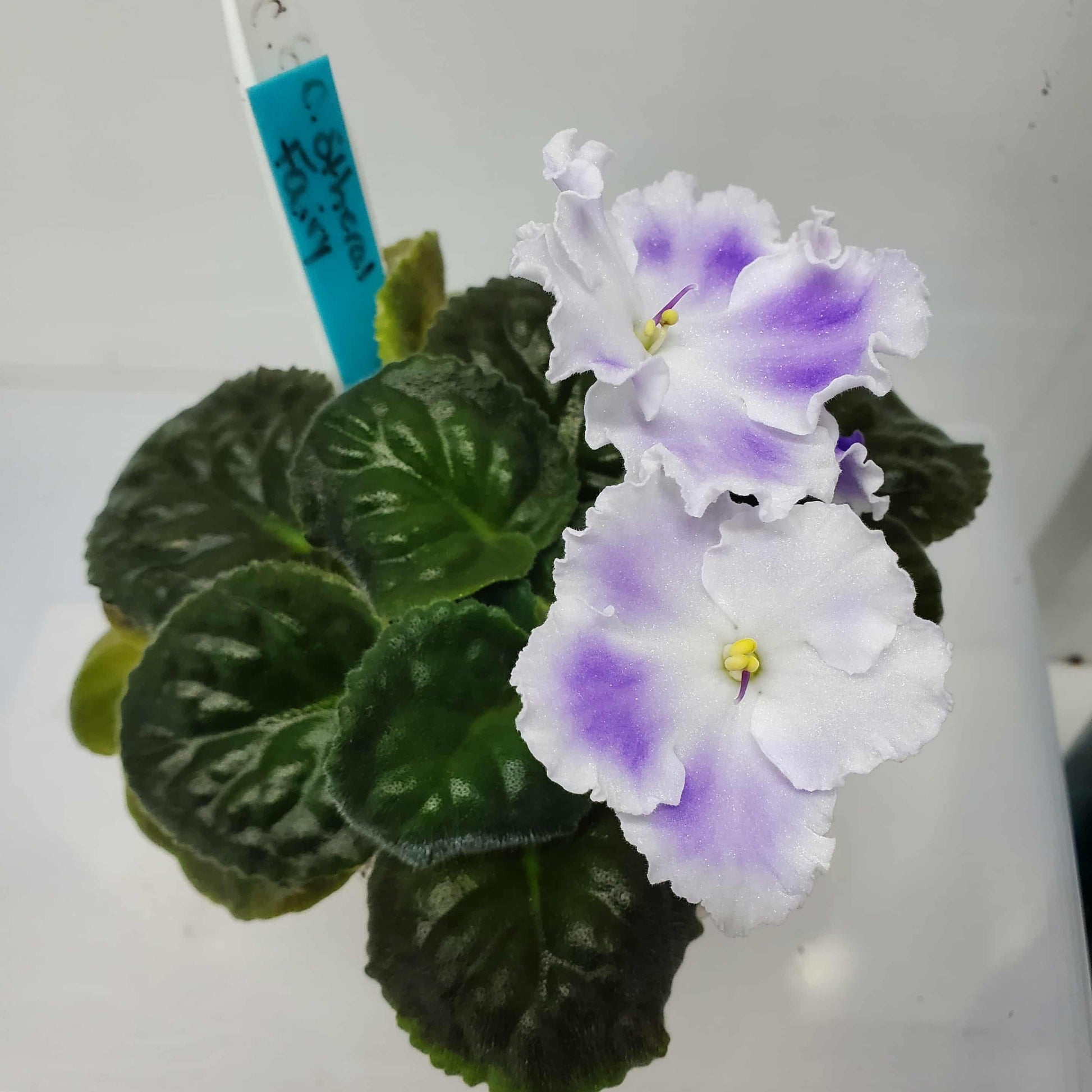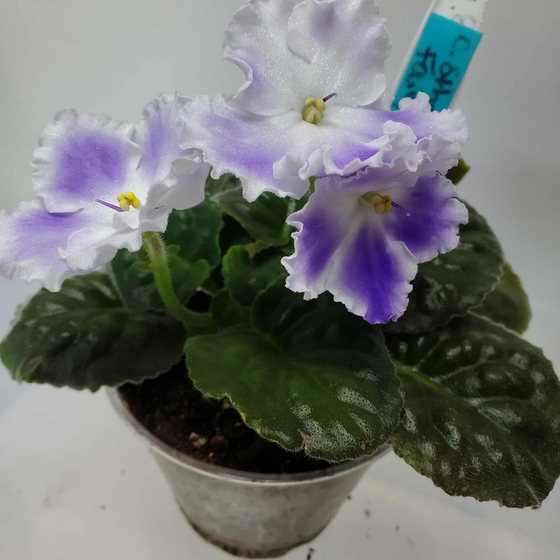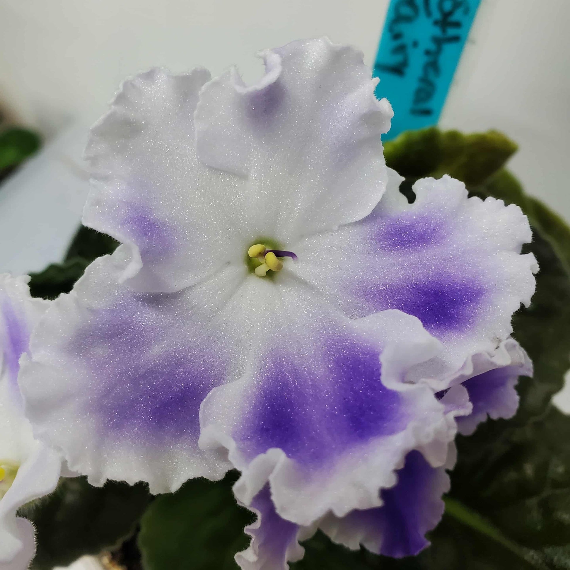 Cajun's Etheral Fairy (10579) 01/11/2013 (B. Thibodeaux) Single purple sticktite pansy/pink fantasy, white upper petals, ruffled white edge. Medium green, plain