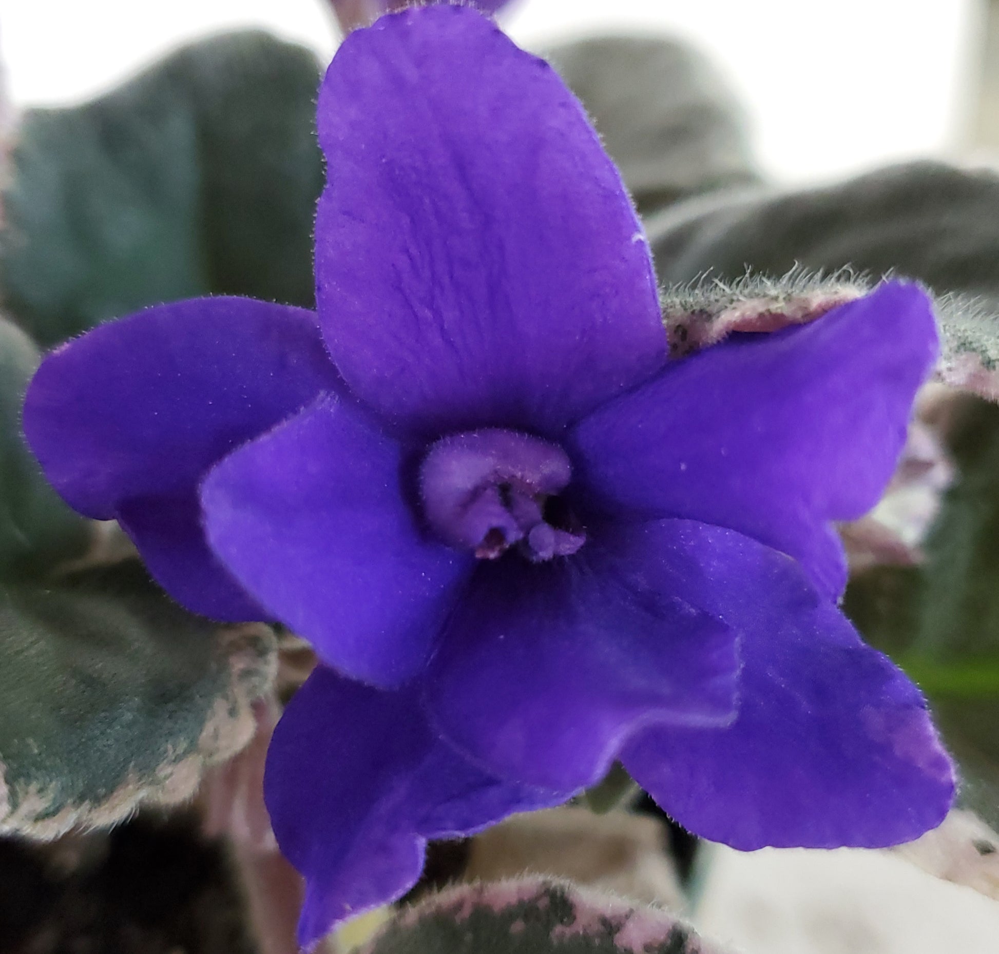 Cajun's Hill Be Blue (10637) 2013 (B. Thibodeaux) Single-semidouble dark blue frilled star. Variegated medium green, cream and pink, plain, quilted. Large
