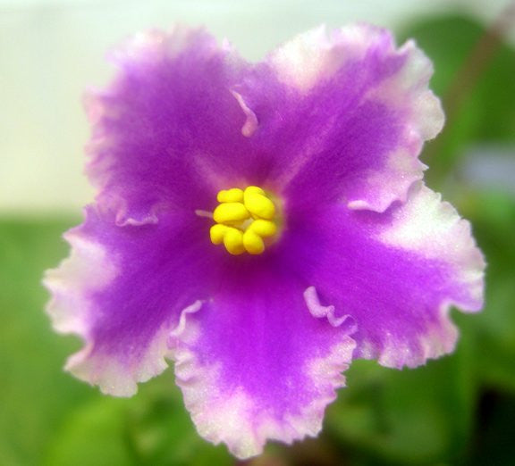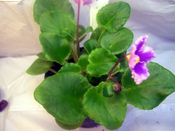 Delta Doll (J. Stokes #8209 06-14-1995) Semidouble magenta star with white streaks over light green plain wavy foliage. Semiminiature