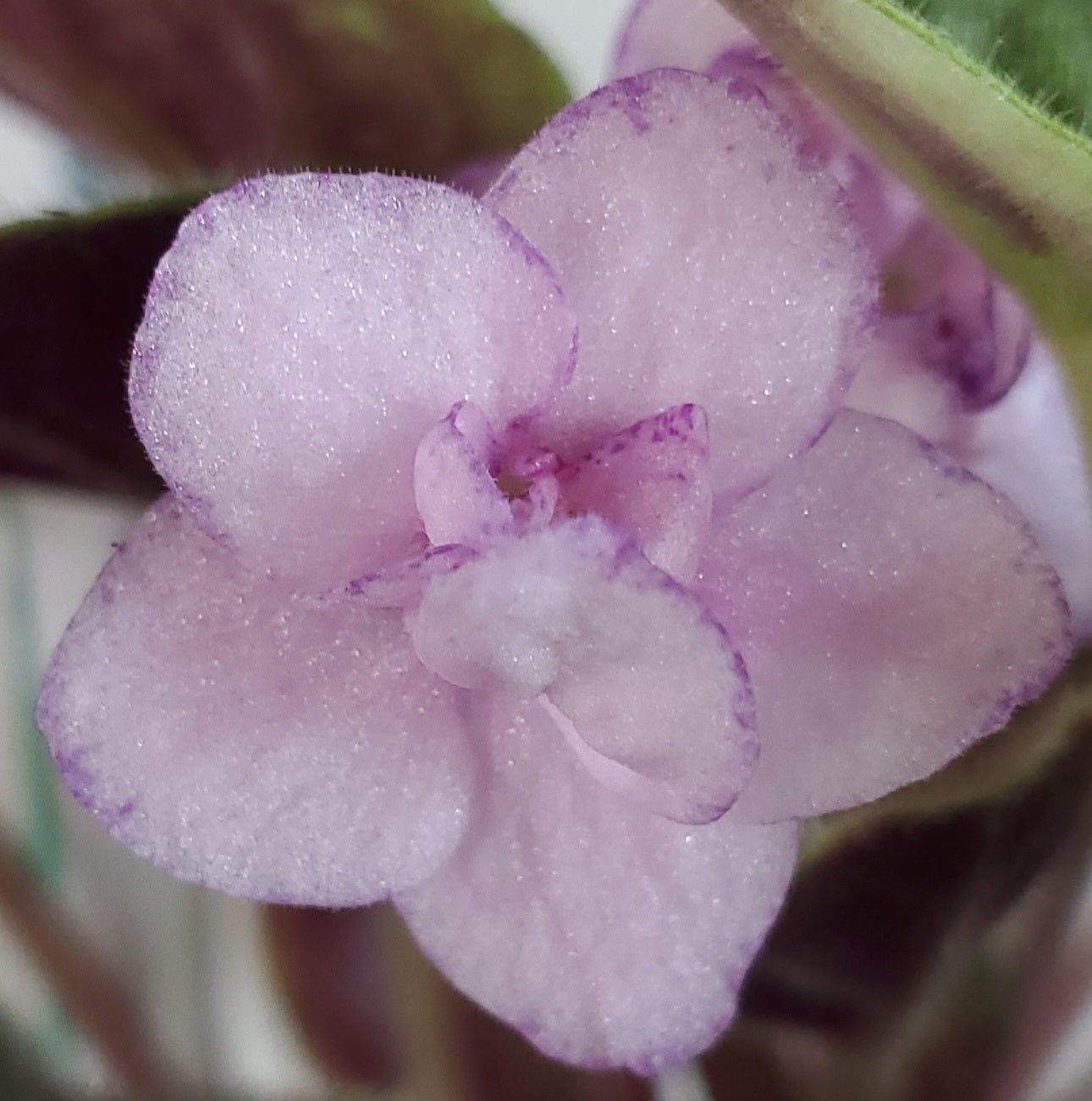Glitter Fountain (I. Fredette) Semidouble pink/some red fantasy, red sparkle edge. Variegated dark green, cream and pink. Standard trailer