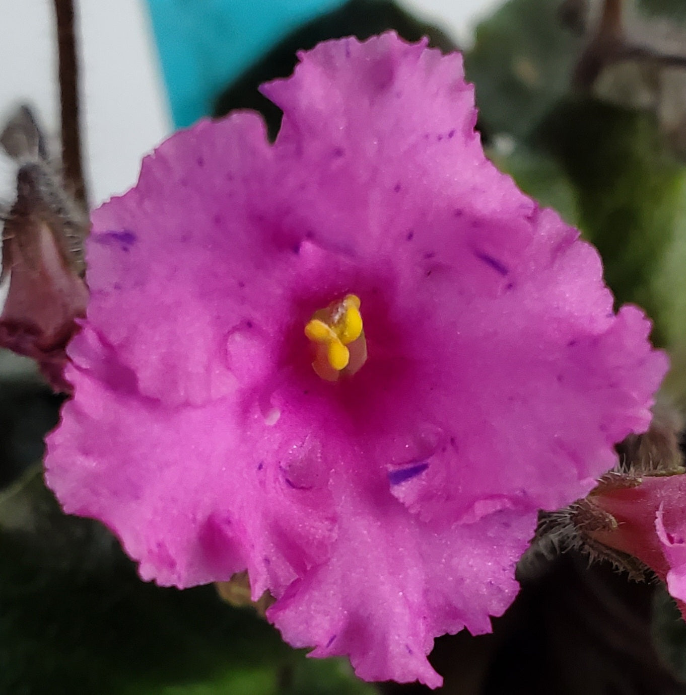 Imp's Fortuitous Fancy (9985) 06/19/2008 (J. Jackson) Single pink frilled bell/blue fantasy. Medium-dark green, wavy, scalloped/red back. Miniature