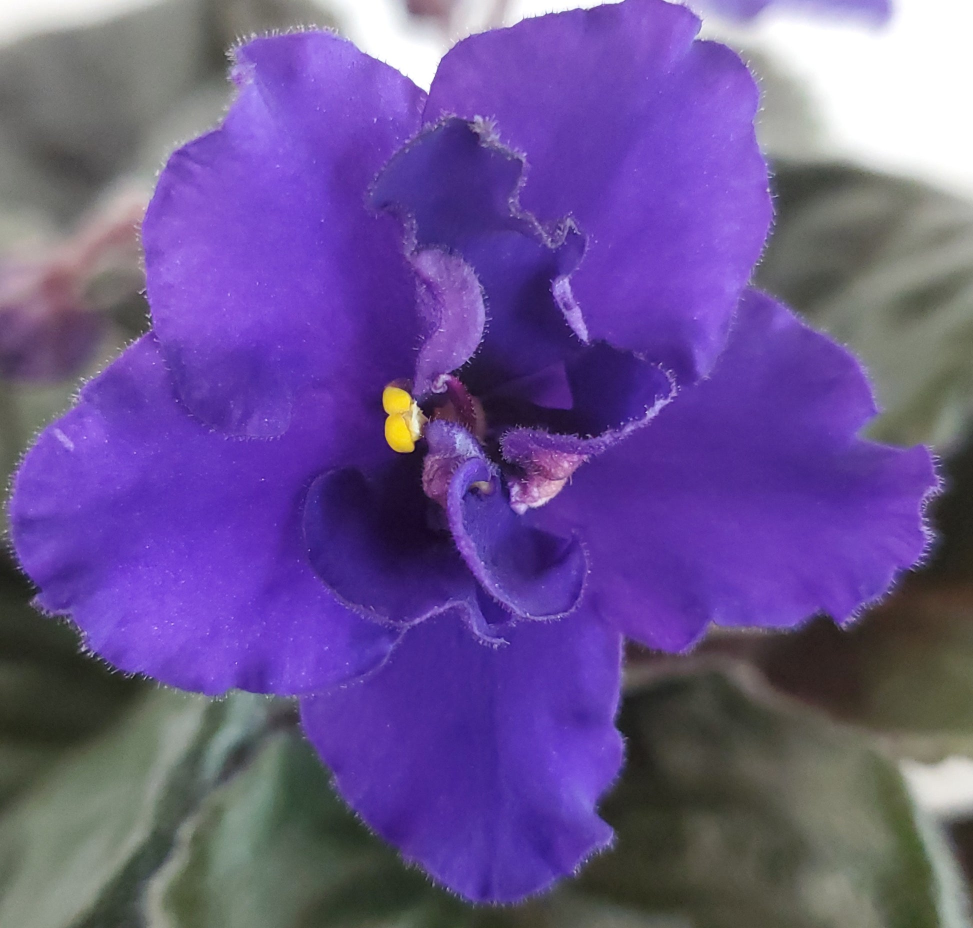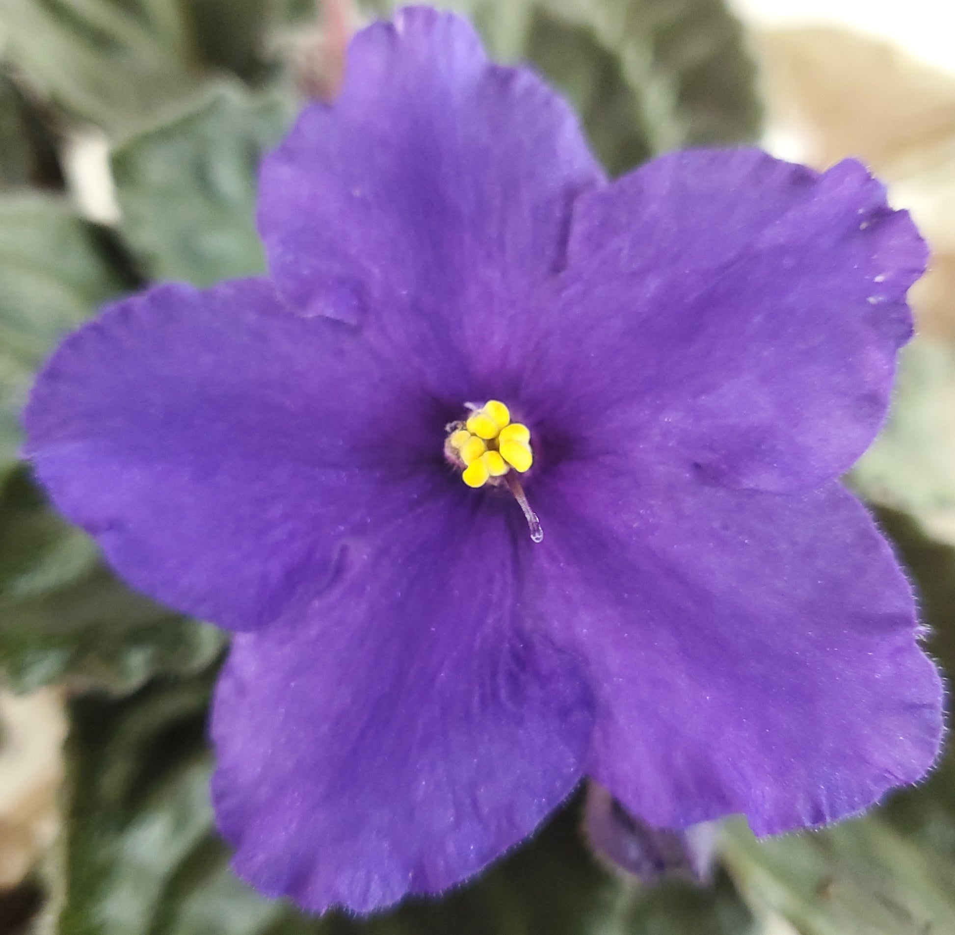 Jean-Paul Paradis (Paradis) Deep Blue Purple semi-double with prominent eye star. Dark green serrated slightly quilted standard foliage.