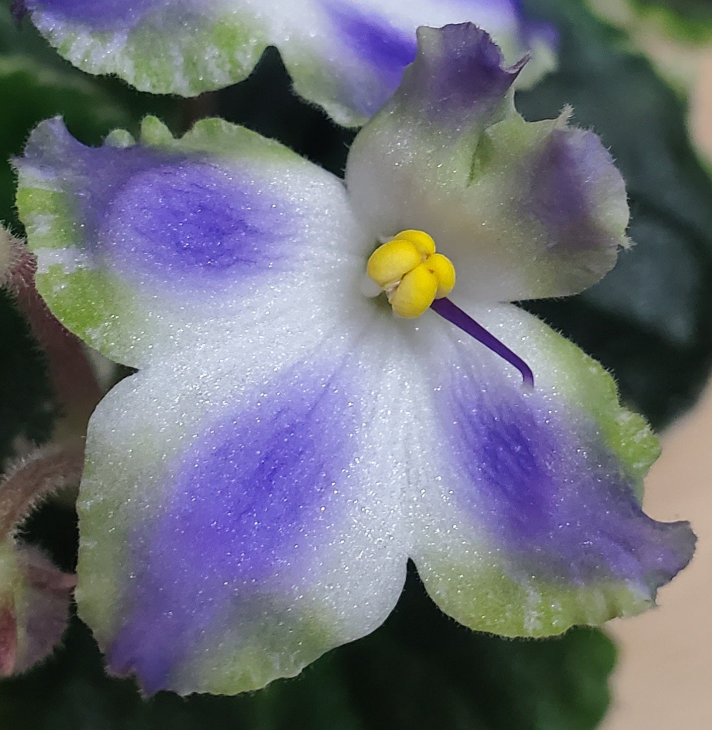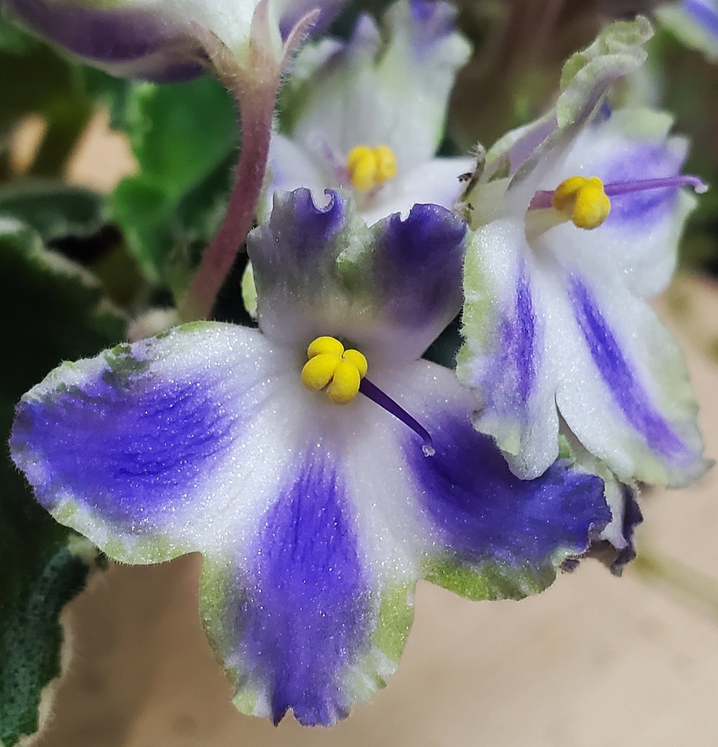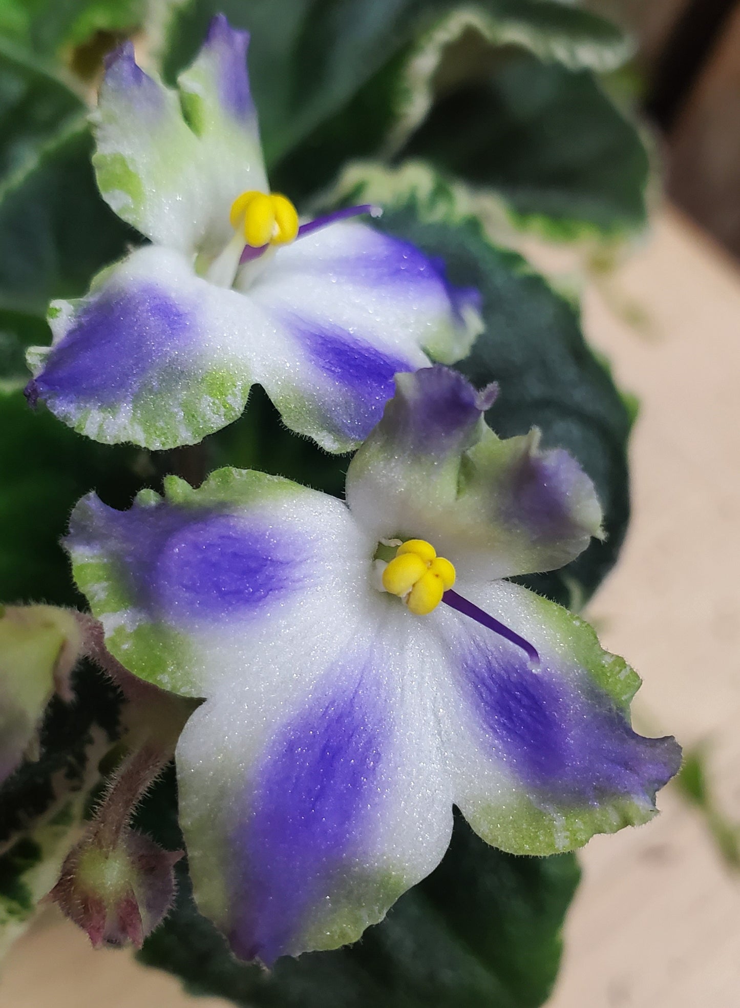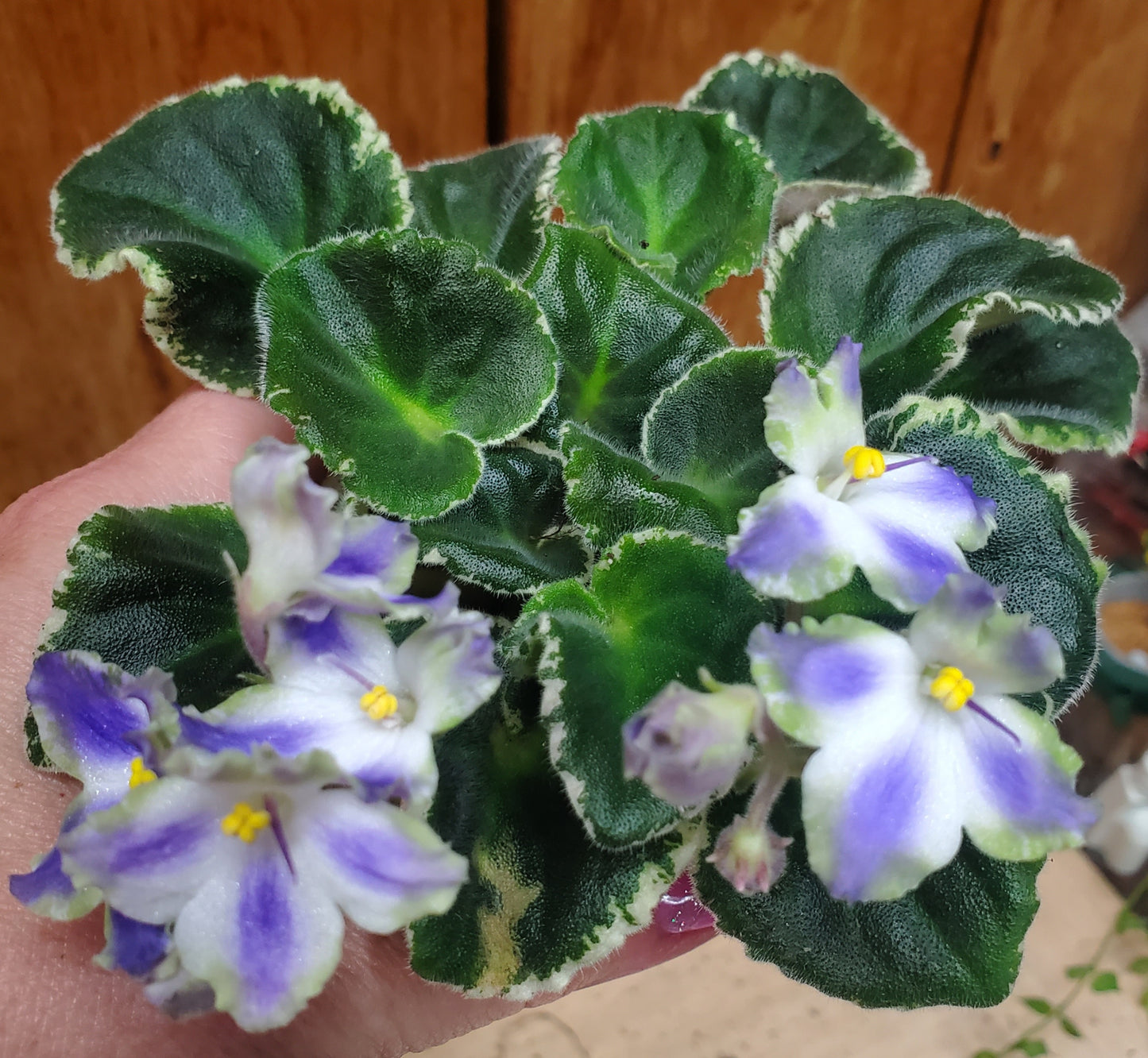 Ma's Secret Child Single white pansies with blue thumbprints giving it a pinwheel effect. Tommie Lou variegated foliage. Standard.