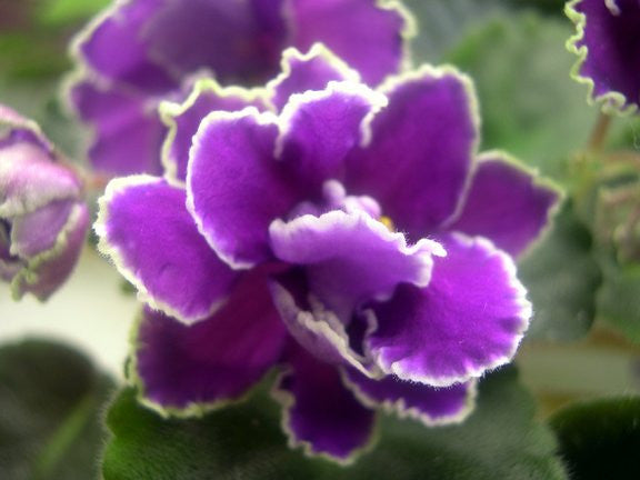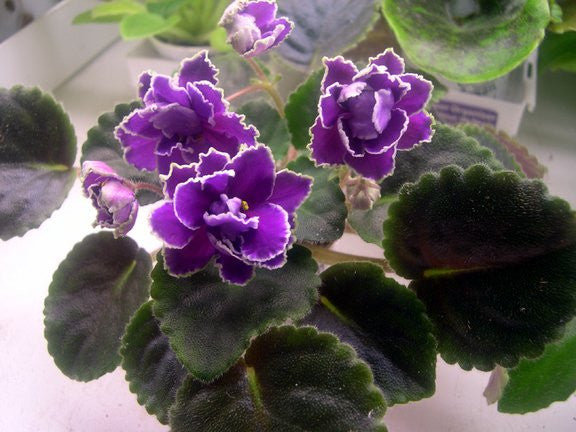 Midnight Treasure 7975 A10/8/93 AS. Sorano Semidouble purple pansy/white ruffled edge. Medium green, plain, pointed/red back. Standard