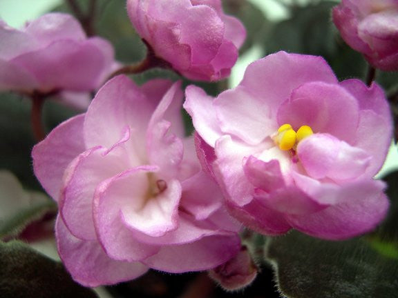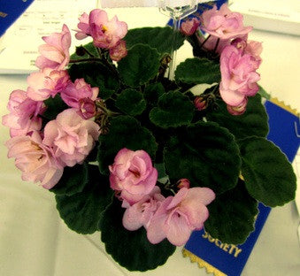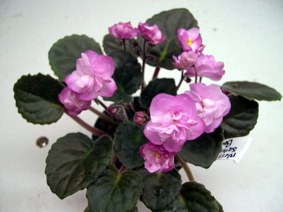 Ness' Satin Rose AVSA Registration: 8144 Double rose mauve two tone star. Dark green quilted scalloped foliage with red back. Semiminiature.