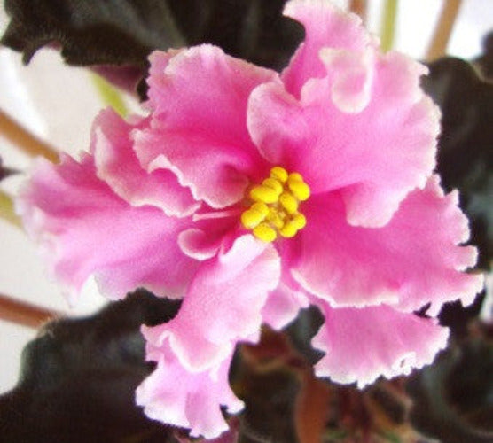Rebel's Strawberry Bites (9085) 12/03/2001 (R. Bann) Semidouble bright pink two-tone large star/white ruffled edge. Dark green, spooned, quilted, glossy, scalloped/red back. Standard