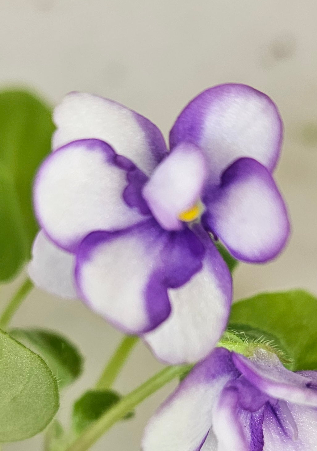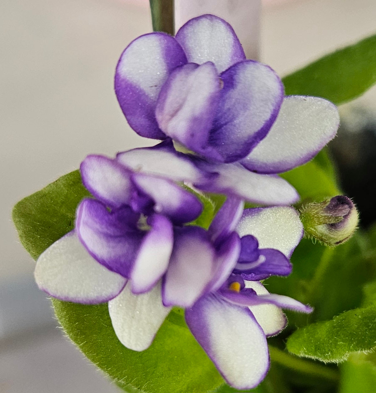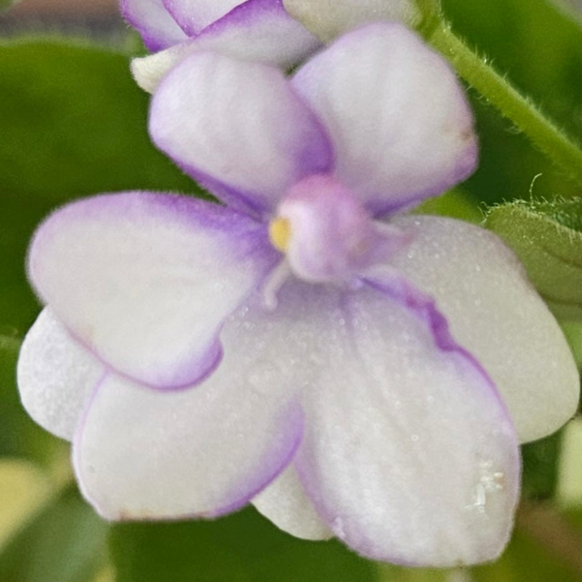 Rob's Humpty Doo (8456) 05/23/1996 (R. Robinson) Semidouble white sticktite pansy/wide bright blue edge. Medium green, pointed, glossy. Semiminiature trailer