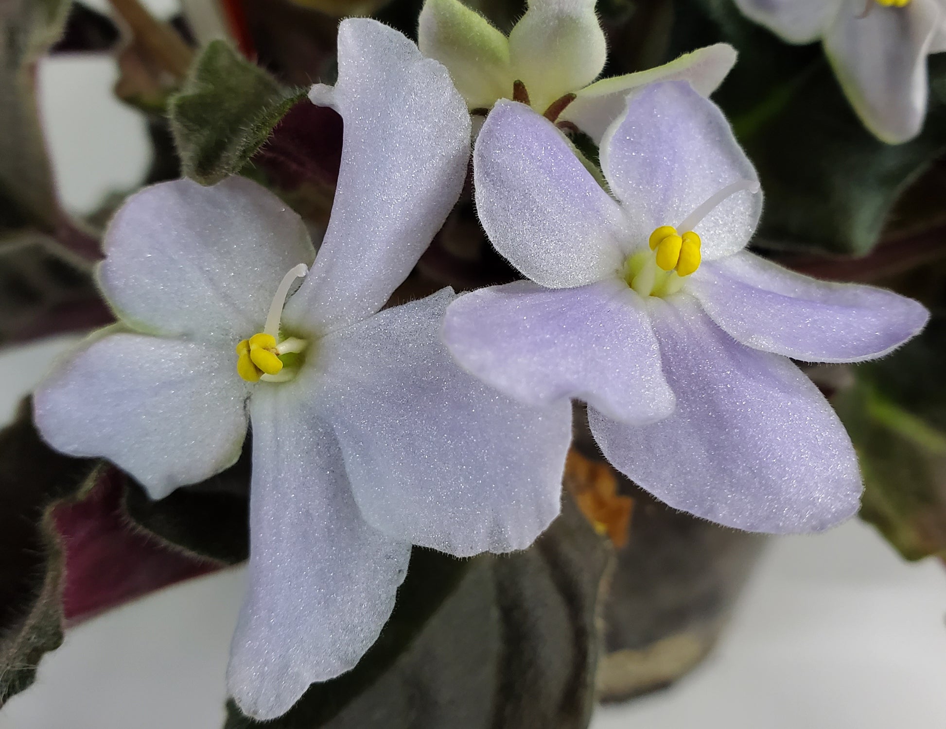 Tony's Blue Magic (T. Hulleman) Sgl med blue sticktite pansy/lighter top petals, grn edge. Med grn,plain,quilted,glossy/red back. Large